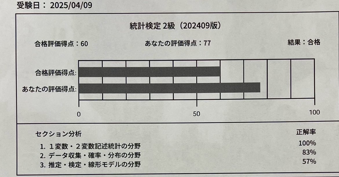 この資格の良いところは不合格でも受験後に分野別に正答率を教えてくれるところです。